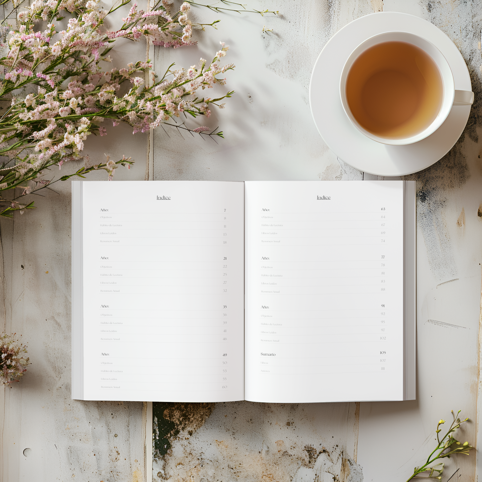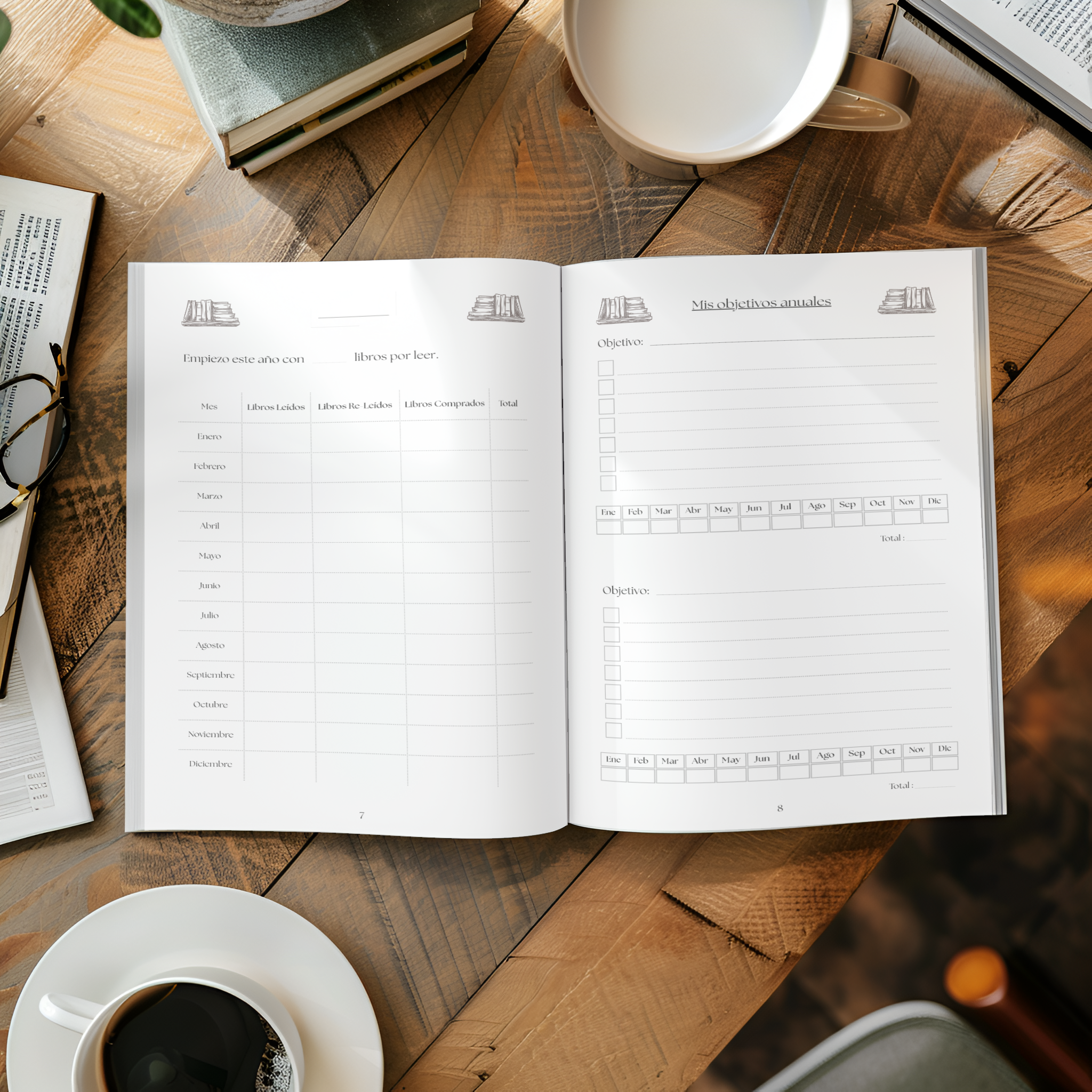 Diseñado para acompañarte durante siete años, este cuaderno permite registrar hasta 55 libros por año, anotar la fecha en que los finalizaste, calificar cada obra y hacer un seguimiento de los libros releídos, comprados y favoritos. Un espacio íntimo, claro y funcional donde podrás reflejar tu evolución como lector/a sin depender de fechas predefinidas.